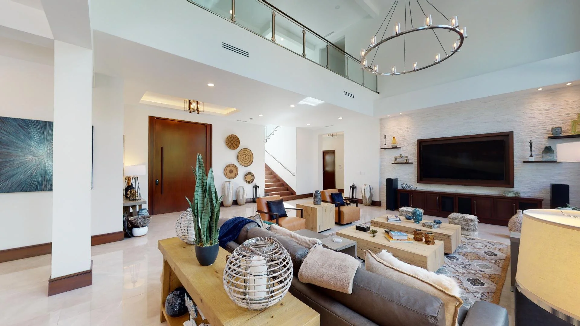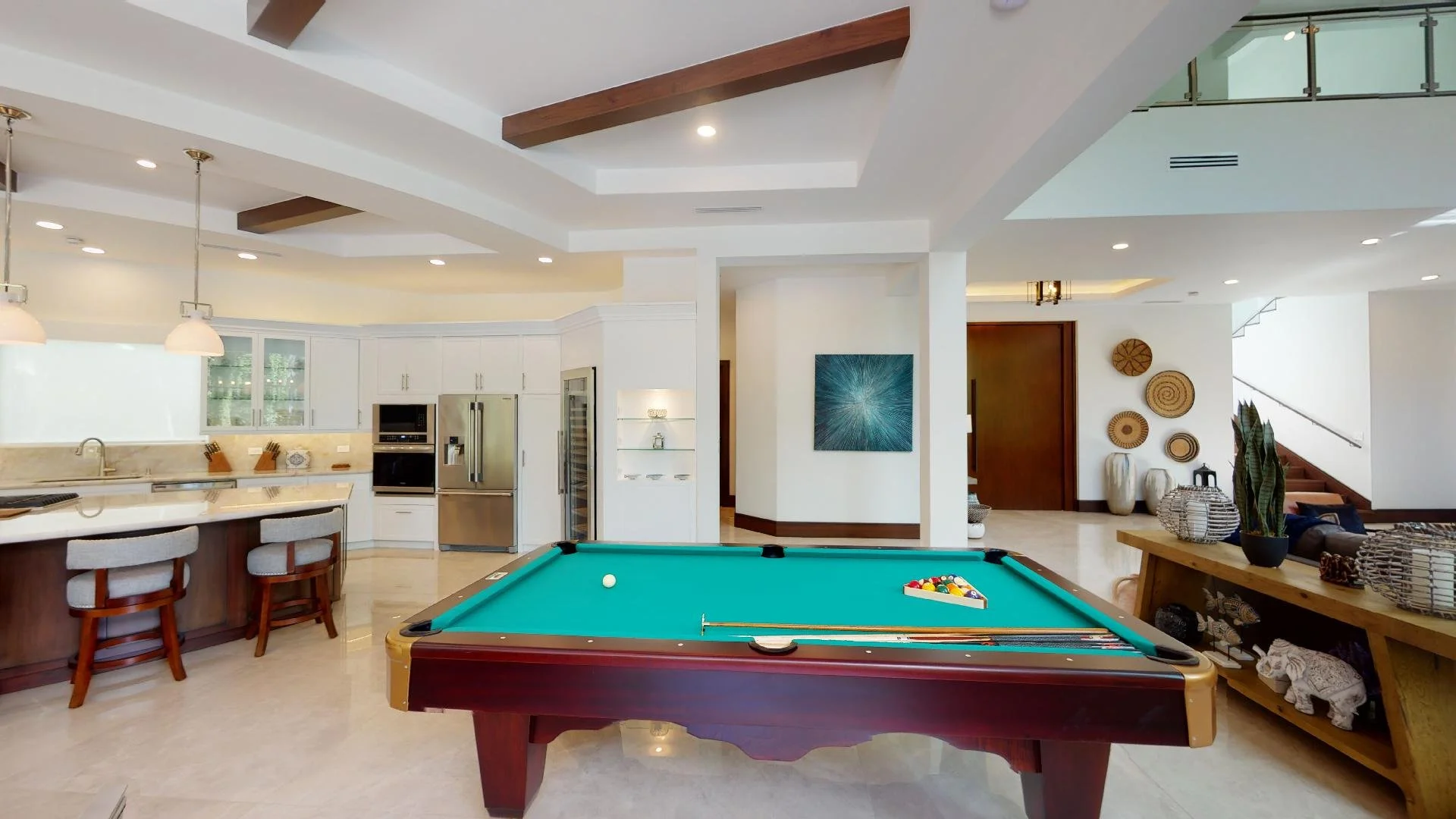 Custom-designed with only the most discerning tastes in mind, featuring a massive chef’s kitchen, large walk-in pantry, comfortable and ample cooking space with top-of-the-line appliances, ice machine, 2 wine chillers, a large indoor dining area, breakfast bar, and granite and quartz countertops. The alfresco dining area is situated just off the kitchen wing with views of the forest beyond. The sweeping deck that overlooks the infinity pool and jacuzzi is the perfect space for lounging in the sun with a good book and a cold drink. Uniquely beautiful, the pool and spa deck boasts green Tikal marble floor tiles throughout.