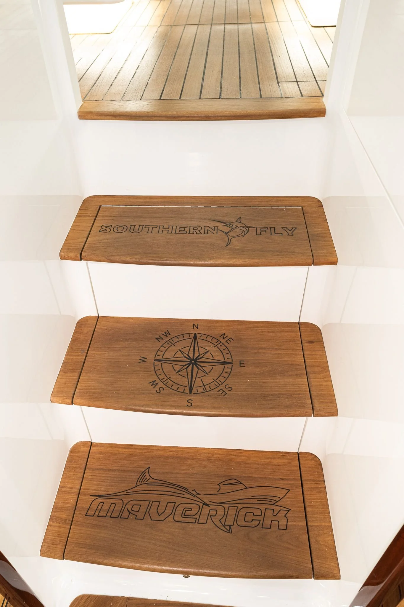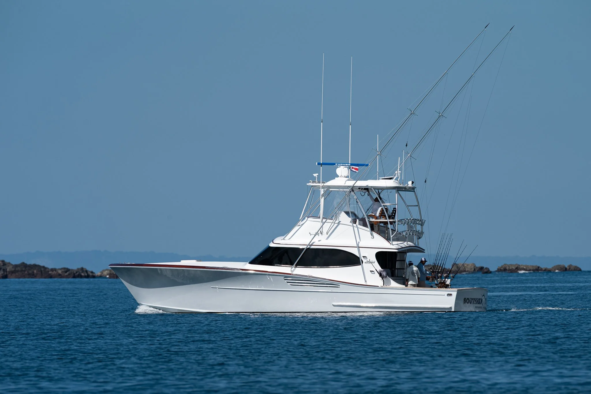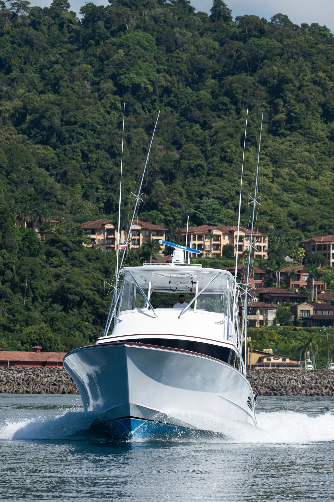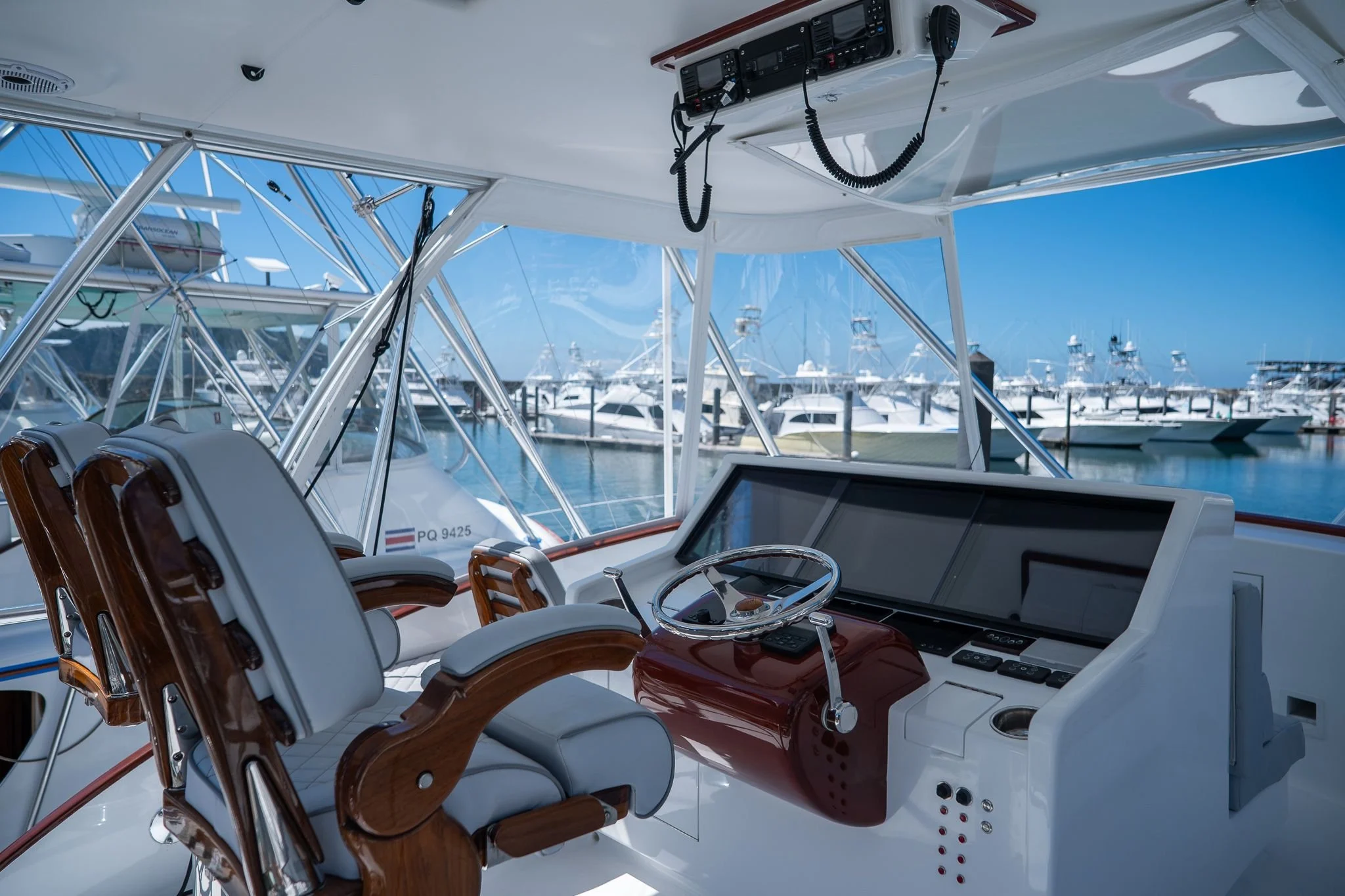 And when you want to kick back between bites? The interior is pure Maverick Costa Rica comfort, hand-crafted teak and mahogany finishes, plush seating, two bathrooms, a shower, and a bridge setup with a captain’s chair, full helm console, and seating for three. All business outside, all comfort inside… and a total showstopper everywhere you look.