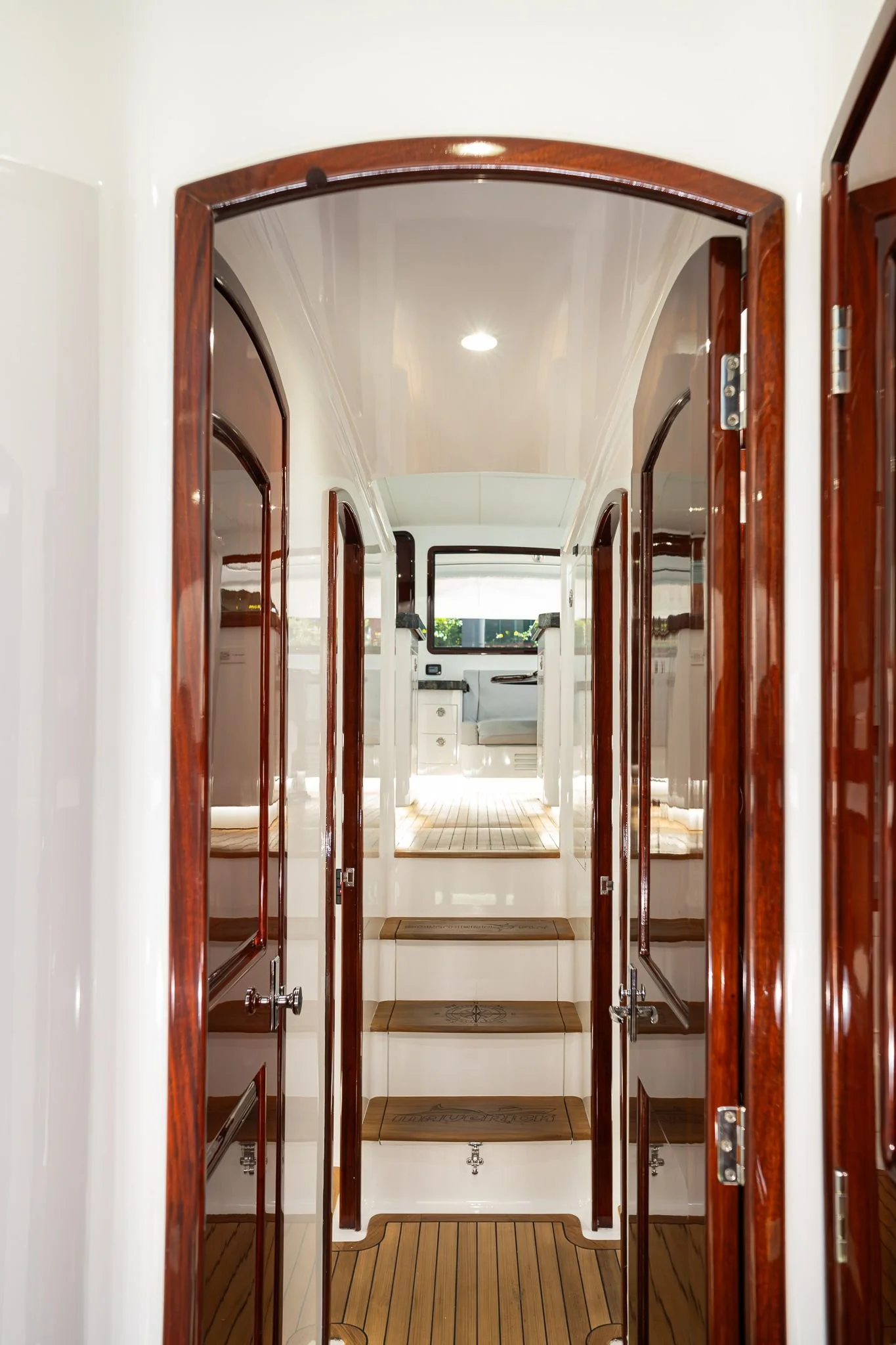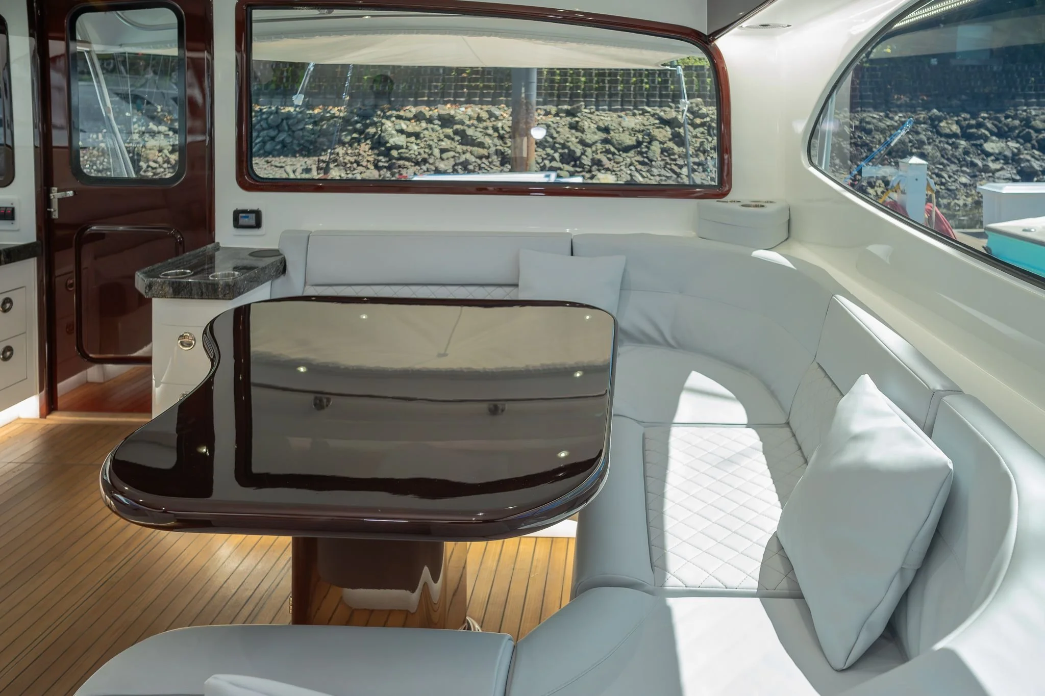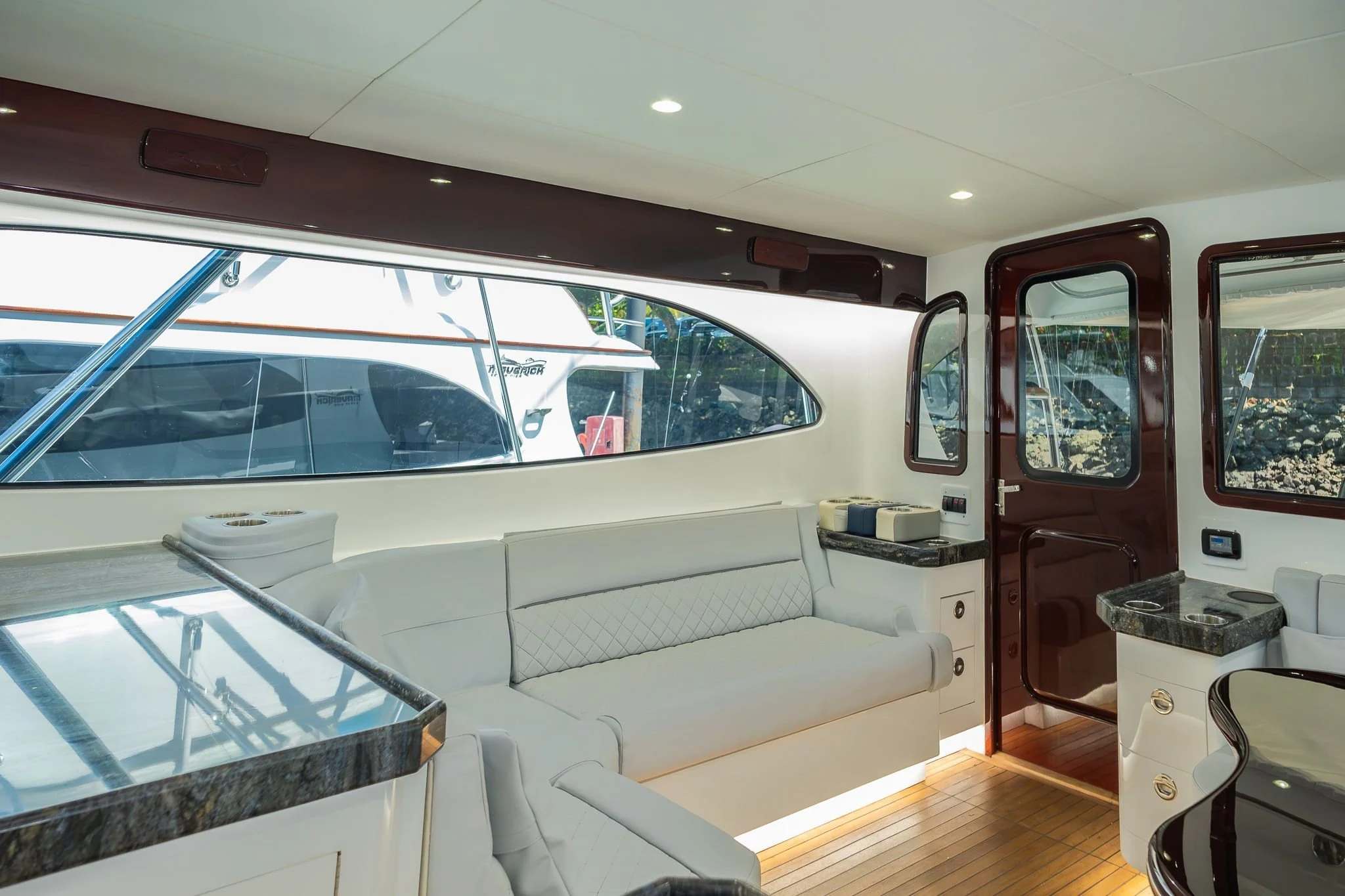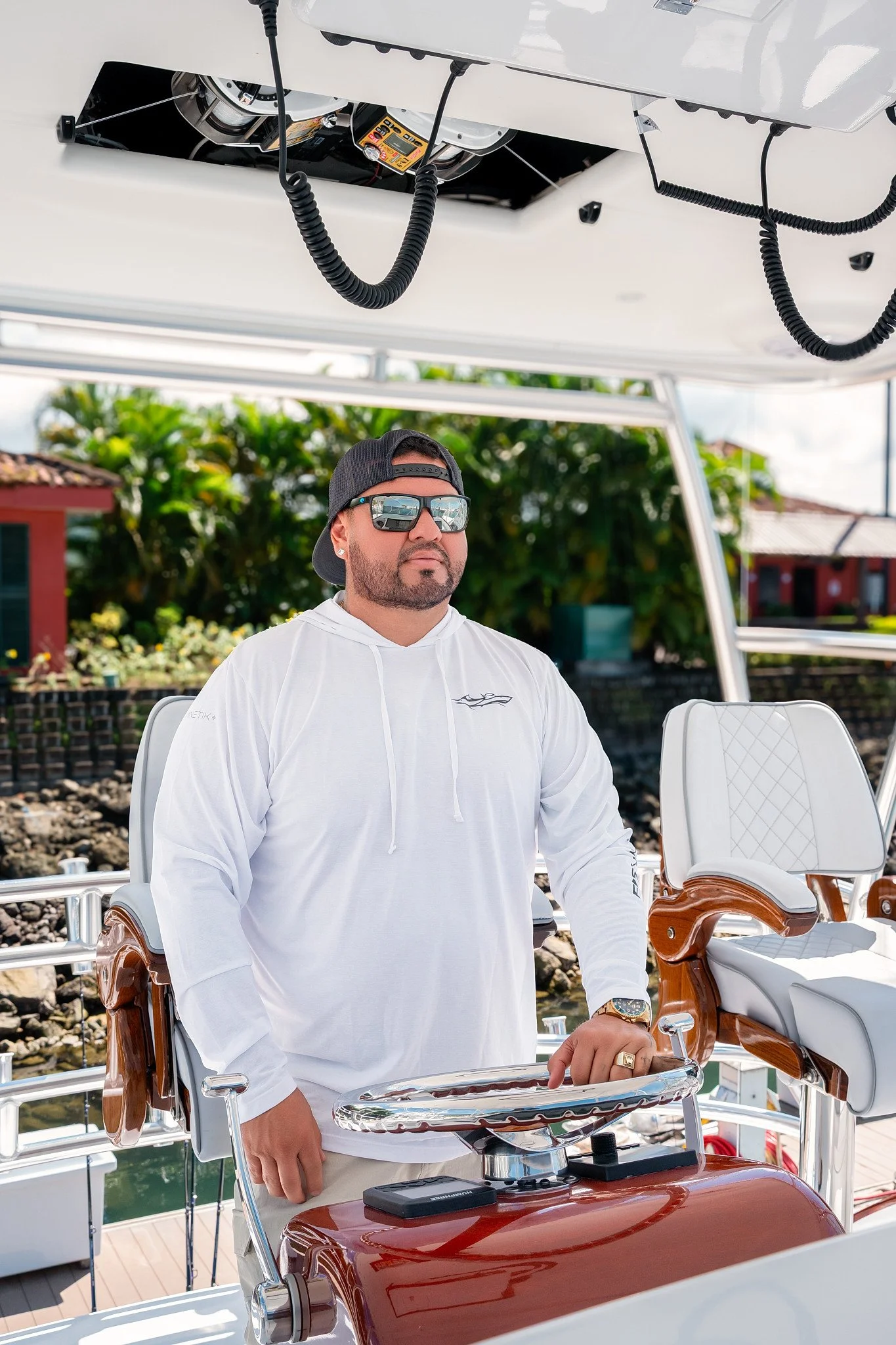 And when you want to kick back between bites? The interior is pure Maverick Costa Rica comfort, hand-crafted teak and mahogany finishes, plush seating, two bathrooms, a shower, and a bridge setup with a captain’s chair, full helm console, and seating for three. All business outside, all comfort inside… and a total showstopper everywhere you look.